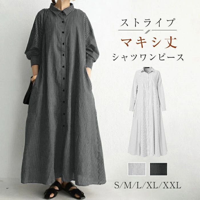 今回レビューするのは、オシャレウォーカーさんの「ワンピース レディース 春 秋 ドレス ロングワンピース 長袖 タック襟 ぽわん袖 ウォッシュ加工 ギャザー ゆったり コットン100% 綿100% ポケット シャツワンピース 羽織 【メール便不可】【20】」です。